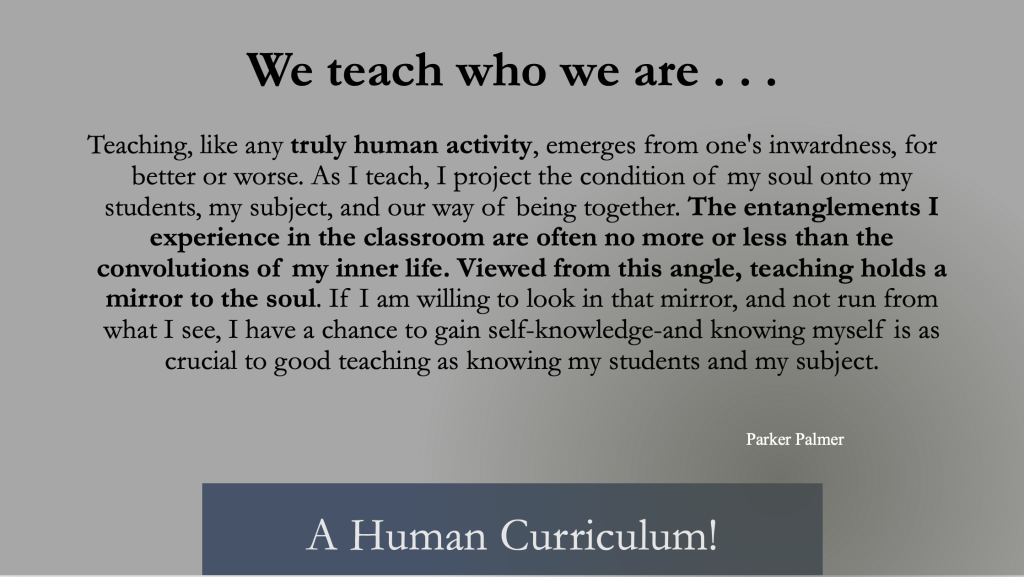 Consider these words from Parker Palmer: The Heart of a Teacher (2008)